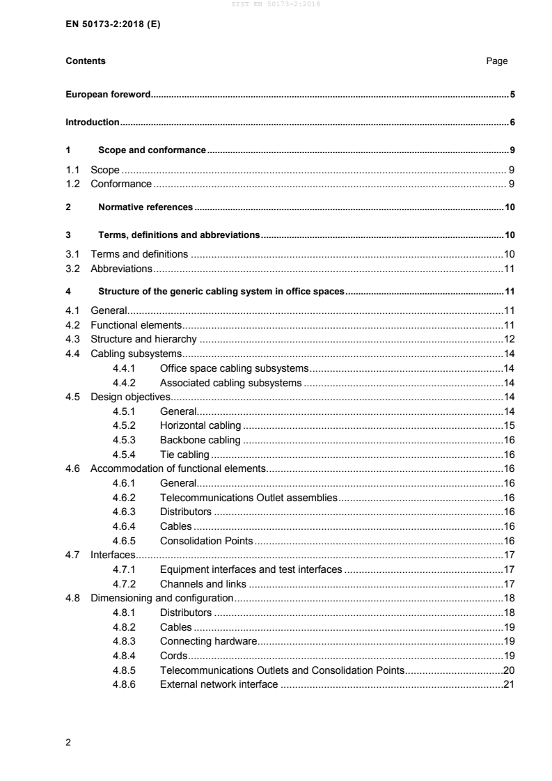 EN 50173-2:2018 - Information technology - Generic cabling systems - Part 2: Office spaces - is a European standard published by CLC/CENELEC that specifies the design, implementation and verification of generic cabling for office premises (and office spaces within other building types). It covers both balanced cabling (twisted-pair) and optical fibre cabling, defining the structure, interfaces and performance requirements for cabling links and channels used to support ICT applications in office environments.