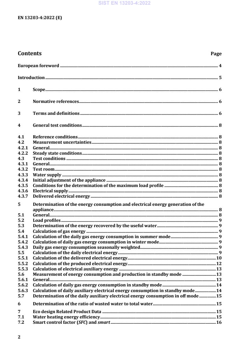 - Test conditions: reference conditions, measurement uncertainty, test room and water supply requirements, electrical supply (e.g. 410 ± 4 V three-phase specified in clause additions).