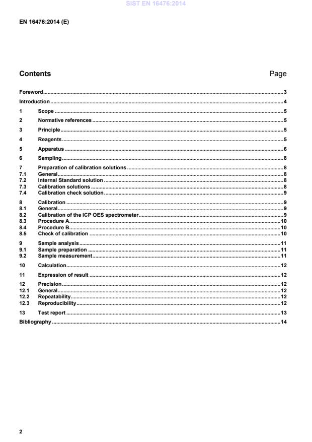 Page Foreword . 3 Introduction . 4 1 Scope . 5 2 Normative references . 5 3 Principle . 5 4 Reagents . 5 5 Apparatus . 6 6 Sampling . 8 7 Preparation of calibration solutions . 8 7.1 General . 8 7.2 Internal Standard solution . 8 7.3 Calibration solutions . 8 7.4 Calibration check solution . 9 8 Calibration . 9 8.1 General . 9 8.2 Calibration of the ICP OES spectrometer . 9 8.3 Procedure A . 10 8.4 Procedure B . 10 8.5 Check of calibration . 10 9 Sample analysis . 11 9.1 Sample preparation . 11 9.2 Sample measurement . 11 10 Calculation . 12 11 Expression of result . 12 12 Precision . 12 12.1 General . 12 12.2 Repeatability . 12 12.3 Reproducibility . 12 13 Test report . 13 Bibliography . 14
