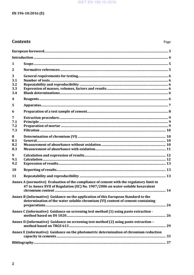 Ta del standarda EN 196 opisuje metodo, ki se uporablja za cement. Ima lahko široko uporabnost, vendar bi bilo treba to preveriti s preskušanjem vsakega izdelka posebej. Navodila o možni uporabi tega evropskega standarda za ugotavljanje vodotopnega kroma (VI) v cementnih pripravkih so podana v dodatku B.