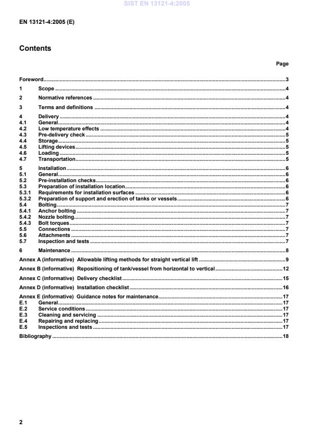 NOTE This may be done by e.g. using the form given in Annex C (informative). 4.7 Transportation Loads occurring during transport shall be considered to ensure that undue stress, local loads and abrasion are not imposed on the GRP tank or vessel. The GRP tank or vessel shall be secured by webbing slings or ropes. NOTE At the destination and before off-loading the GRP tank or vessel should be visually inspected. The results of inspec-tion should be recorded, e.g. using the form Annex C (informative). SIST EN 13121-4:2005