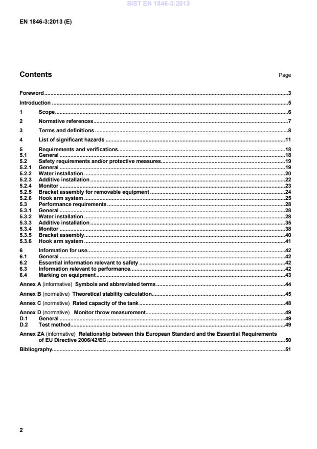 Ta del tega evropskega standarda določa minimalne zahteve za varnost in obnašanje v uporabi nekatere neobvezne posebne trajno vgrajene opreme v gasilskih in reševalnih vozilih, ki jih upravljajo usposobljene osebe, kot je navedeno v standardu EN 1846-1 in opredeljeno v standardu EN 1846-2. Trajno vgrajena oprema iz tega dela tega evropskega standarda je navedena spodaj: – vodna napeljava; – napeljava za tekoče aditive; – monitor; – nosilci za opremo; – razstavljivi sistemi, ki uporabljajo hidravlično kljuko. Ta del tega evropskega standarda naj bi se bral v povezavi z morebitnimi nacionalnimi predpisi, ki veljajo za vozila, ki uporabljajo javne ceste, ter v povezavi z morebitnimi veljavnimi direktivami EU in povezanimi uredbami EFTA, ki se nanašajo na vozila in njihovo opremo. Za namene tega evropskega standarda je običajen razpon temperature okolja –15 °C do +35 °C. Za opremo, ki se bo uporabljala pri temperaturi zunaj tega temperaturnega razpona, naj bi uporabnik opredelil veljavni temperaturni razpon, proizvajalec pa naj bi z oceno tveganja določil vse potrebe po dodatnih preventivnih ukrepih.