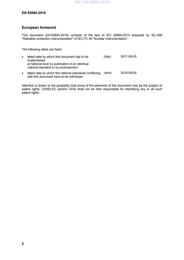 SIST EN 62694:2016 is a standard published by the Slovenian Institute for Standardization (SIST). Its full title is "Radiation protection instrumentation - Backpack-type radiation detector (BRD) for the detection of illicit trafficking of radioactive material (IEC 62694:2014)". This standard covers: This Standard applies to backpack-type radiation detectors (BRDs) that are used for the detection of illicit trafficking of radioactive material. This standard establishes the operational and performance requirements for BRDs. BRDs are portable instruments designed to be worn during use. They may also be used as temporary area monitors in a stand-alone mode.