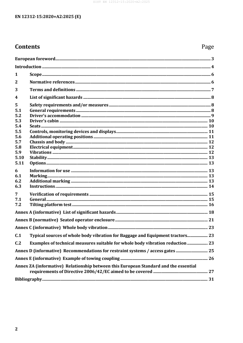 EN 12312-15:2020+A2:2025 is the CEN (European) standard that sets specific safety and technical requirements for aircraft ground support equipment (GSE) - specifically baggage and equipment tractors. It applies to self‑propelled tractors with driver accommodation used to tow baggage and equipment trailers on airports. The document updates the 2020 edition with Amendment 2 (A2, 2025) and is intended to reduce hazards during commissioning, operation and maintenance when equipment is used as intended (including reasonably foreseeable misuse).
