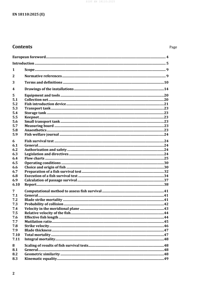 Ta dokument zajema oceno preživetja rib v črpalnih postajah in hidroelektrarnah, opredeljeno kot delež rib, ki prehajajo skozi objekt brez večjih poškodb. Ne zajema posrednih posledic takšnih objektov, ki so običajno vključene v pojem »varnost rib« ali »prijaznost do rib«, kot je preprečevanje vpliva na selitev rib, vedenjske spremembe, poškodbe med prehajanjem gorvodno, začasno omamljanje rib, zaradi česar so lahko izpostavljene plenilcem, ali pomanjkanje kisika. Ta dokument se uporablja za črpalke in turbine v črpalnih postajah in hidroelektrarnah, ki obratujejo v vodnih telesih površinskih voda oziroma med njimi, v rekah, potokih ali ustjih, v katerih so prisotni avtohtoni in/ali selitveni staleži rib. Objekti vključujejo centrifugalne črpalke (radialne, z mešanim pretokom, aksialne), Arhimedove vijake in vodne turbine (Francisova turbina, Kaplanova turbina, cevna turbina s hruško, Straflo turbina itd.). Opisani sta naslednji metodi za oceno preživetja rib: – Preskusi preživetja, ki vključujejo izpust živih rib, v skupinah preskusnih in kontrolnih rib gorvodno in dolvodno od objekta, čemur sledi njihov ponovni ulov v zbirne mreže s polnim pretokom. Metoda se uporablja za preskuse preživetja na terenu in v laboratoriju (točka 6). – Validirana računska metoda, ki temelji na modelu ter vključuje model stika z lopatico in povezave za kvantifikacijo biološkega odziva na udarec lopatice (točka 7). Računsko metodo je mogoče uporabiti za prilagoditev rezultatov laboratorijskih preskusov preživetja rib na obrate polne velikosti, ki obratujejo v različnih pogojih (točka 8). Preskuse preživetja in računsko metodo je mogoče uporabiti tudi za turbine v odprtih vodah, pri čemer veljajo opozorila iz dodatka C. Rezultate preskusa preživetja in izračunane ocene je mogoče primerjati z domnevno najvišjo trajnostno stopnjo umrljivosti za dano populacijo rib na lokaciji črpalne postaje ali hidroelektrarne. Vendar ta dokument ne opredeljuje najvišjih stopenj, na podlagi katerih bi bilo mogoče napravo označiti kot »ribam prijazno«, niti ne opisuje metode za določanje takšne najvišje stopnje. Ta dokument podaja integrirano metodo za ocenjevanje preživetja rib v črpalnih postajah in hidroelektrarnah s preskusi preživetja rib in z izračuni, ki temeljijo na modelu. Tako vladnim kot nevladnim agencijam za varstvo okolja omogoča, da enotno ocenijo vpliv na avtohtone in selitvene staleže rib. S tem bo dokument pripomogel k ohranitvi populacij rib in zmanjšanju trenda upadanja selitvenih staležev rib. Od tega dokumenta bodo imeli korist tudi proizvajalci črpalk in turbin, saj določa enotna in jasna merila za oceno preživetja rib. Poleg tega lahko fizikalni model, ki je podlaga za računsko metodo v tem dokumentu, služi kot orodje za razvoj novih izdelkov. Za akademske kroge in raziskovalne ustanove ta dokument predstavlja izhodišče skupnega razumevanja. Služil bo kot spodbuda za nadaljnje raziskave, s katerimi bi lahko zapolnili vrzeli in izboljšali obstoječe metode ocenjevanja.