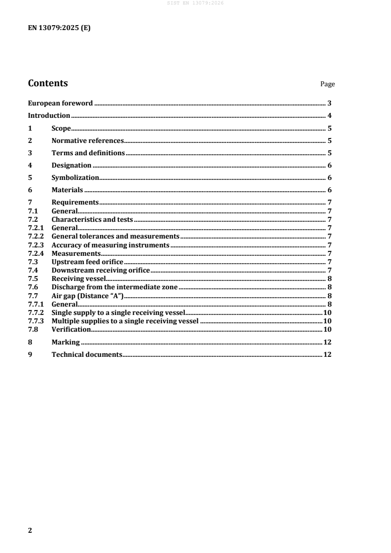 SIST EN 13079:2026 is a standard published by the Slovenian Institute for Standardization (SIST). Its full title is "Devices to prevent pollution by backflow of potable water - Air gap with injector - Family A - Type D". This standard covers: This document specifies the characteristics and the requirements of air gap with injector Family A, Type D for nominal flow velocity not exceeding 3 m/s. Air gaps are devices for protection of potable water in water installations from pollution by backflow. This document is applicable to air gaps in factory-assembled products and to constructed air gaps in situ and specifies requirements and methods to verify and ensure compliance with this document during normal working use. The fluid in the receiving vessel is assumed to have similar properties to the water supply. Where this is not the case, additional care or tests can be required to verify the efficacy of the solution in practical use. The AD device is intended to be used in potable water installations according to EN 806 (all parts).