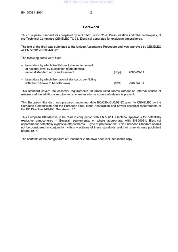 Foreword This European Standard was prepared by WG 31-73, of SC 31-7, Pressurization and other techniques, of the Technical Committee CENELEC TC 31, Electrical apparatus for explosive atmospheres. The text of the draft was submitted to the Unique Acceptance Procedure and was approved by CENELEC as EN 50381 on 2004-03-01. The following dates were fixed: – latest date by which the EN has to be implemented