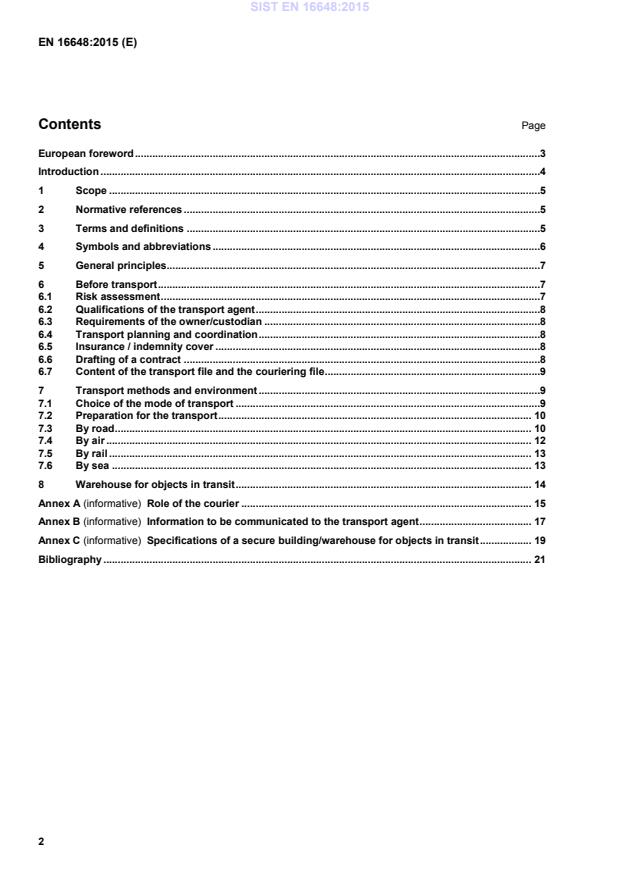 European foreword .3 Introduction .4 1 Scope .5 2 Normative references .5 3 Terms and definitions .5 4 Symbols and abbreviations .6 5 General principles.7 6 Before transport .7 6.1 Risk assessment .7 6.2 Qualifications of the transport agent .8 6.3 Requirements of the owner/custodian .8 6.4 Transport planning and coordination .8 6.5 Insurance / indemnity cover .8 6.6 Drafting of a contract .8 6.7 Content of the transport file and the couriering file .9 7 Transport methods and environment .9 7.1 Choice of the mode of transport .9 7.2 Preparation for the transport . 10 7.3 By road . 10 7.4 By air . 12 7.5 By rail . 13 7.6 By sea . 13 8 Warehouse for objects in transit . 14 Annex A (informative)