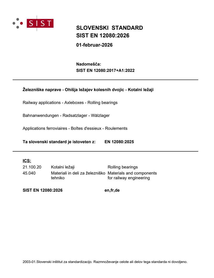 SIST EN 12080:2026 is classified under the following ICS (International Classification for Standards) categories: 21.100.20 - Rolling bearings; 45.040 - Materials and components for railway engineering. The ICS classification helps identify the subject area and facilitates finding related standards.