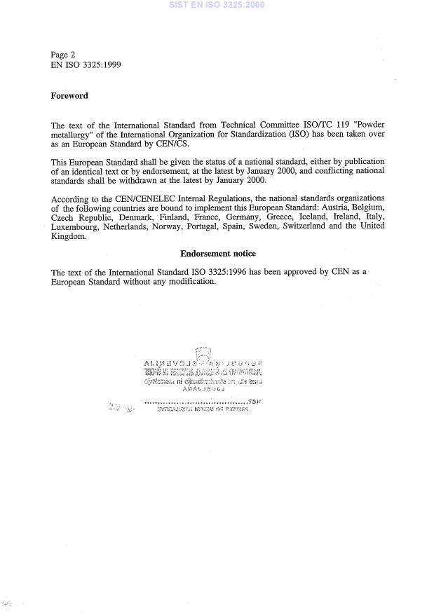 SIST EN ISO 3325:2000 is classified under the following ICS (International Classification for Standards) categories: 77.040.10 - Mechanical testing of metals; 77.160 - Powder metallurgy. The ICS classification helps identify the subject area and facilitates finding related standards.