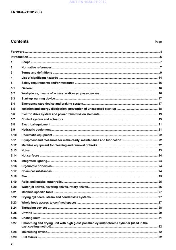 Figure 1 — Example of a coating machine . 10Figure 2 — Example of a coating machine with four coating sections . 11Figure 3 — Example of a S-type pull group . 12Figure 4 — Safety distance ≥ 2,70 m on drum reeler . 36Figure 5 — Safety distance ≥ 500 mm to prevent crushing by reels behind the drum reeler . 38 Tables Table 1 — List of significant hazards . 14Table 2 — List of safety functions, Performance Level and Safety Integrity Level specified in this standard . 20Table 3 — Methods used to verify safety requirements and/or measures . 42 SIST EN 1034-21:2012