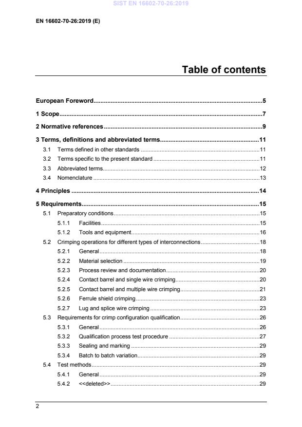 Process identification and documentation. • New crimp combinations beyond those identified in the Scope. • Test methods and acceptance criteria for both specific and generic types of interconnections are specified. • Quality assurance measures for both the operator and the inspector are prescribed: Training and certification of personnel, Calibration of tools and equipment, Workmanship standards and acceptance criteria, Inspection criteria and sequence, Records from material incoming inspection through delivery of the end product, including KIP, MIP, travellers, follow-up sheets, log books, traceability samples and the handling of deviations by RFA or NCR. It is important to perform the work taking into account health and safety regulations, and in particular the national standards on this subject. SIST EN 16602-70-26:2019