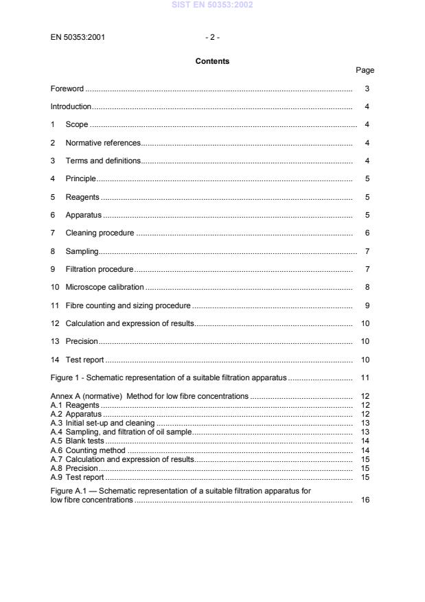 Method for low fibre concentrations.12A.1 Reagents.12A.2 Apparatus.12A.3 Initial set-up and cleaning.13A.4 Sampling, and filtration of oil sample.13A.5 Blank tests.14A.6 Counting method.14A.7 Calculation and expression of results.15A.8 Precision.15A.9 Test report.15Figure A.1 — Schematic representation of a suitable filtration apparatus forlow fibre concentrations.16SIST EN 50353:2002