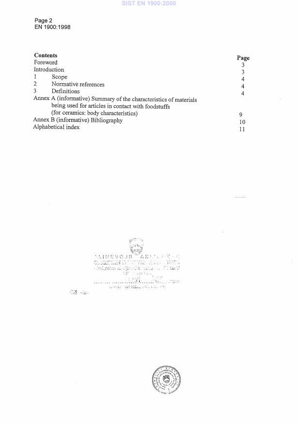 SIST EN 1900:2000 is a standard published by the Slovenian Institute for Standardization (SIST). Its full title is "Materials and articles in contact with foodstuffs - Non-metallic tableware - Terminology". This standard covers: This European Standard defines terms related to certain materials for non-metallic tableware in contact with foodstuffs. It only includes those articles composed of the following materials: glass, glass ceramics, porcelain, vitreous china/vitrified tableware, stoneware, earthenware, common pottery or plastic.