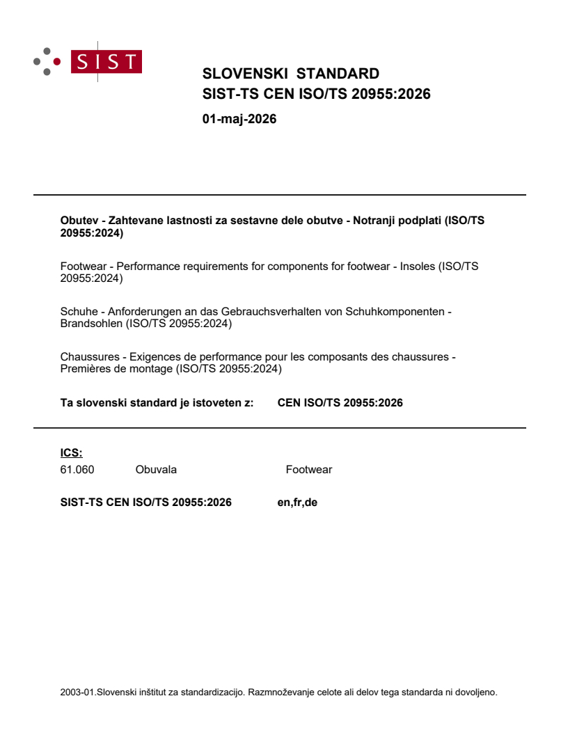 SIST-TS CEN ISO/TS 20955:2026 is a technical specification published by the Slovenian Institute for Standardization (SIST). Its full title is "Footwear - Performance requirements for components for footwear - Insoles (ISO/TS 20955:2024)". This standard covers: This document establishes the performance requirements for insole components for footwear in order to assess the suitability for the end use and/or fitness for purpose. It also establishes the test methods to be used to evaluate the compliance with the requirements. This document applies to insoles for all kinds of footwear as defined in Clause 4. This document can be used as a reference by the manufacturer and the supplier.