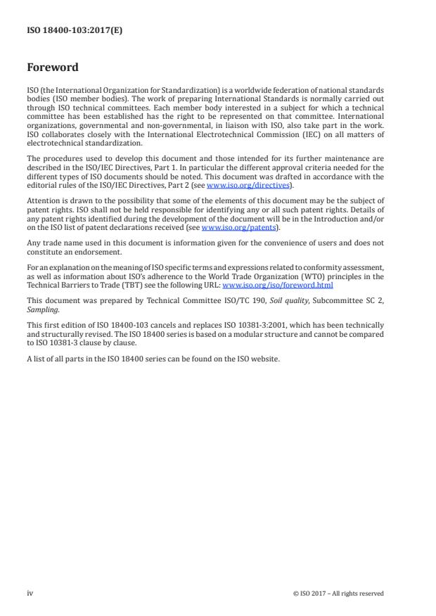ISO 18400-103:2017 gives guidelines for: - identification of hazards that could be encountered during a site investigation and when collecting samples of soil and other ground material, including hazards that are intrinsic in the sampling operation (e.g. physical hazards) in addition to the hazards that might arise, e.g. from contamination with chemicals or biological agents; - measures to be adopted to control risks once an appropriate risk assessment has been carried out.