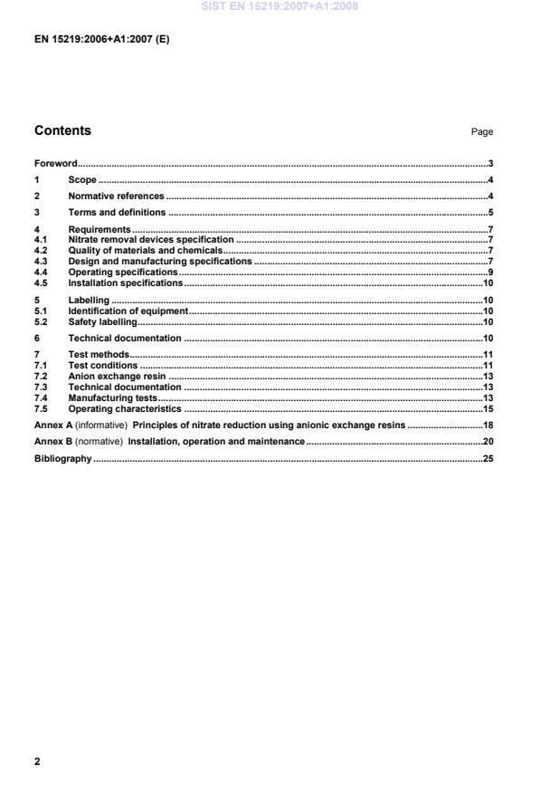 - Methods for measuring exchange capacity, brining efficiency, salt consumption, regeneration water volume, residual nitrate concentration and manufacturing tests. Annex A explains nitrate removal principles; Annex B covers installation, operation and maintenance.