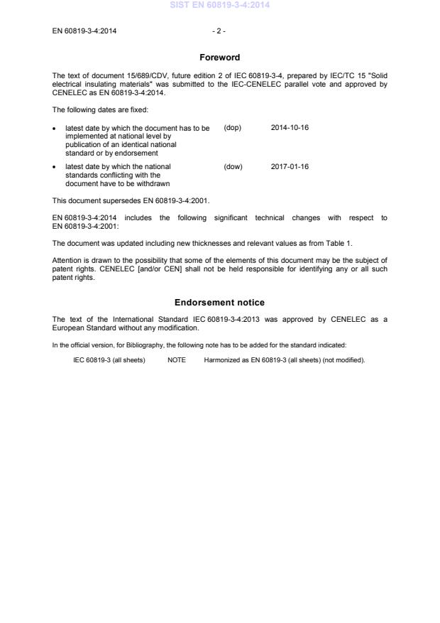 SIST EN 60819-3-4:2014 is a standard published by the Slovenian Institute for Standardization (SIST). Its full title is "Non-cellulosic papers for electrical purposes - Part 3: Specifications for individual materials - Sheet 4: Aramid fibre paper containing not more than 50 % of mica particles". This standard covers: IEC 60819-3-4:2013 specifies requirements for two types of aramid fibre paper containing mica particles and designated as PAaM: - type 1: calendered aramid paper containing mica particles; - type 2: uncalendered aramid paper containing mica particles. Materials which conform to this specification meet established levels of performance. However, the selection of material by a user for a specific application should be based on the actual requirements necessary for adequate performance in that application and not based on this specification alone. SAFETY WARNING: It is the responsibility of the user of the methods contained or referred to in this document to ensure that they are used in a safe manner. This second edition cancels and replaces the first edition published in 2001. This edition constitutes a technical revision. This edition includes the following significant technical changes with respect to the previous edition: the document was updated including new thicknesses and relevant values as from Table 1. Keywords: aramid fibre paper containing mica particles, PAaM, calendered, uncalendered