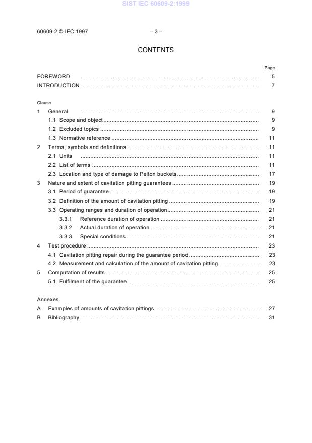 This standard serves as a basis for the formulation of guarantees on cavitation pitting on Pelton turbine runners. It also provides a basis for the measurement and evaluation of the amount of cavitation pitting on Pelton turbine runners of a given turbine, which is defined in the contract by power, specific hydraulic energy of machine (head), rotational speed, material, operation etc. Guarantees which restrict the extent of caviation pitting and drop erosion on Pelton turbies at the end of an operating period specified in the contract are necessary when the pitting is expected in all or in some operating ranges.