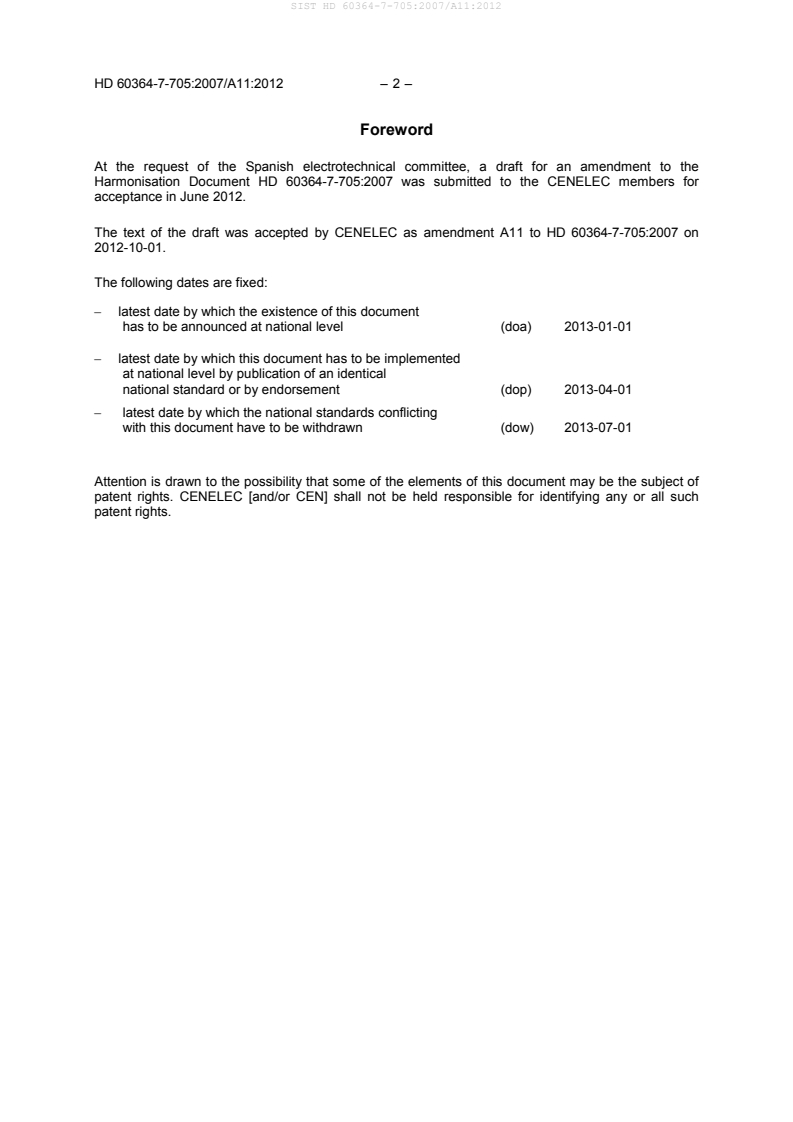 This amendment A11 modifies the Harmonization Document HD 60364-7-705:2007; it was approved by