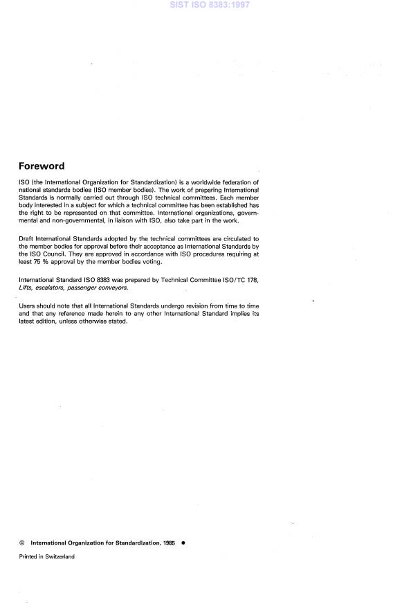 SIST ISO 8383:1997 is a standard published by the Slovenian Institute for Standardization (SIST). Its full title is "Lifts on ships -- Specific requirements". This standard covers: Lays down requirements for design, installation and inspection. It is necessary to ensure compliance with such statutory requirements, rules and regulations as may be applicable to any individual ship as well as with lift safety codes.