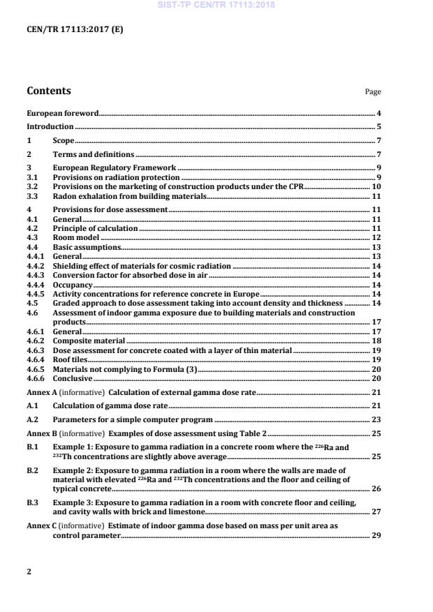 SIST-TP CEN/TR 17113:2018 is a technical report published by the Slovenian Institute for Standardization (SIST). Its full title is "Construction products - Assessment of release of dangerous substances - Radiation from construction products - Dose assessment of emitted gamma radiation". This standard covers: The aim of this Technical Report is to propose a methodology to determine indoor gamma dose from building materials and to help classify such a product as required in the Construction Products Regulation [7]. This first technical approach could be a precursor for the development of a harmonized European Standard based on this methodology. NOTE 1 In this Technical Report, doses from radon and thoron exhalation are excluded. However, in 3.3, information is given on how radon exhalation is dealt with in (EU)2013/59/Euratom, the Basic Safety Standards Directive (2013/59/EURATOM) [1]. NOTE 2 Compliance with national exemption levels for NORM nuclides remains.