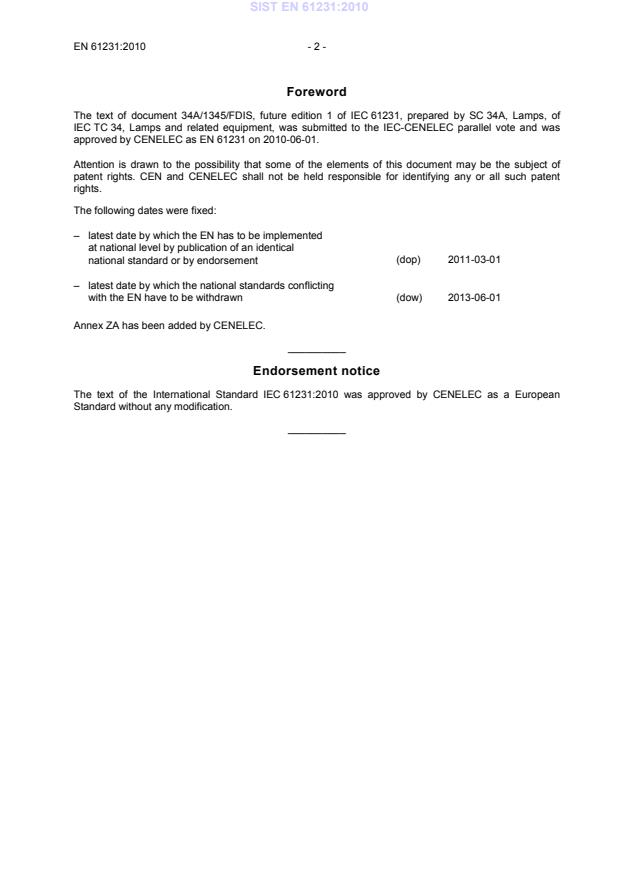 Foreword The text of document 34A/1345/FDIS, future edition 1 of IEC 61231, prepared by SC 34A, Lamps, of IEC TC 34, Lamps and related equipment, was submitted to the IEC-CENELEC parallel vote and was approved by CENELEC as EN 61231 on 2010-06-01. Attention is drawn to the possibility that some of the elements of this document may be the subject of patent rights. CEN and CENELEC shall not be held responsible for identifying any or all such patent rights. The following dates were fixed: – latest date by which the EN has to be implemented