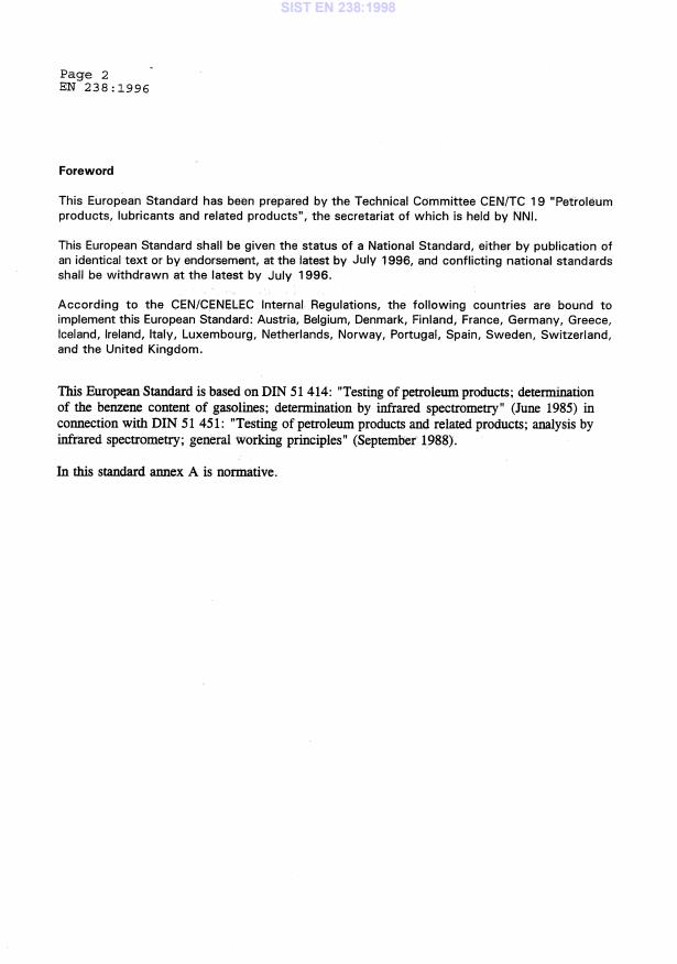 Laboratories implementing EN 238:1996 should consider complementary or newer standards for petrol analysis, instrument validation, and quality assurance. Where available, refer to current CEN guidance or national regulations for benzene limits and updated test methods.