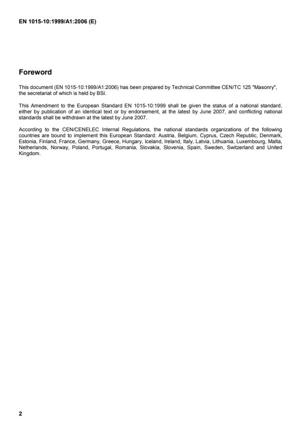 This amendment A1 modifies the European Standard EN 1015-10:1999; it was approved by CEN on 26 October 2006.