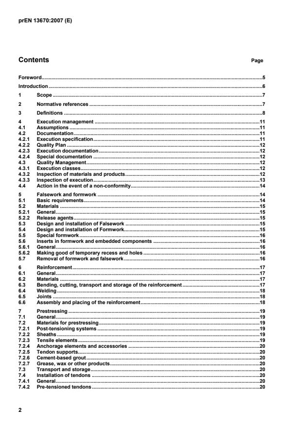 Keywords: oSIST prEN 13670:2007, execution of concrete structures, concrete construction standards, European concrete standards, formwork, falsework, reinforcement, prestressing, concreting operations, precast concrete, geometrical tolerances, quality management in concrete, CEN technical standards.