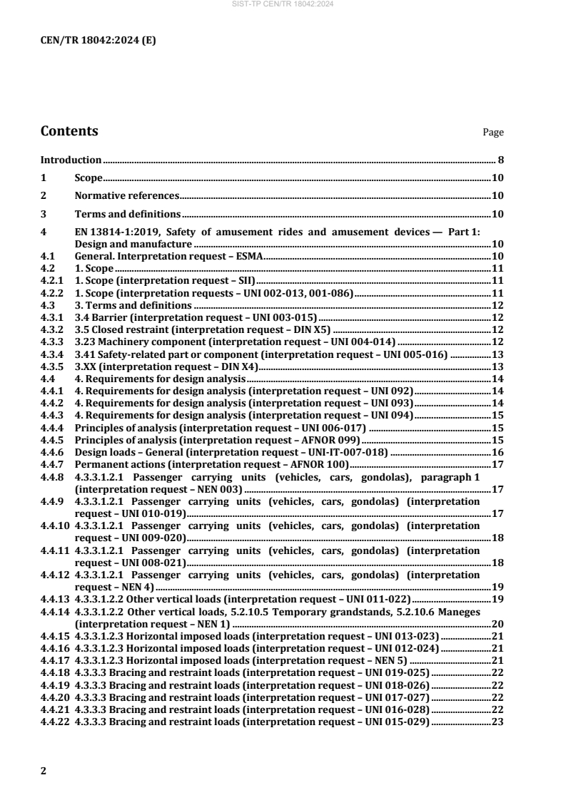 SIST-TP CEN/TR 18042:2024 is a CEN Technical Report that provides official replies to requests for interpretation of EN 13814:2019 - the European standard for the safety of amusement rides and amusement devices. Approved by CEN in March 2024, this TR compiles clarifications across all parts of EN 13814:2019 to ensure consistent application of safety, design and manufacture requirements throughout Europe.