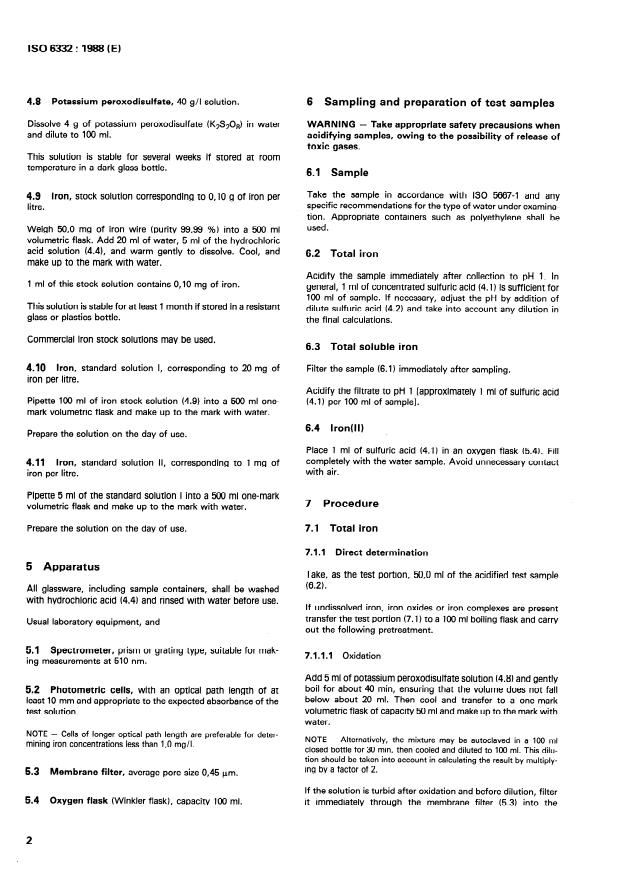 ISO 6332:1988 specifies a spectrometric method using 1,10-phenanthroline for the determination of iron in water and wastewater. The standard covers procedures for measuring: