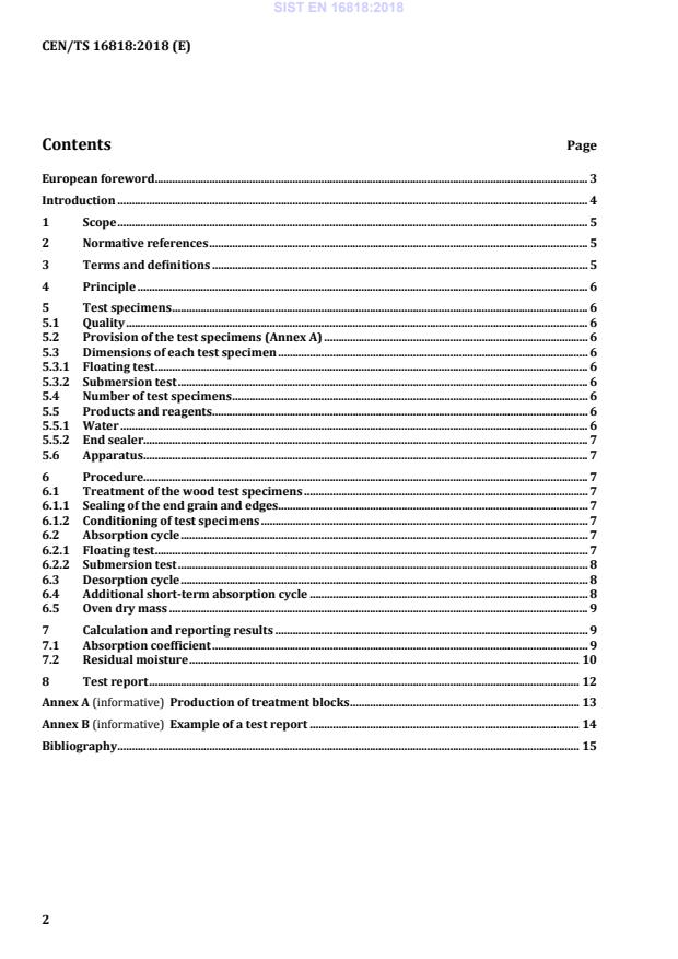 3.1 supplier sponsor of the test (person or company providing the samples or wood-based products to be tested) 3.2 residue moisture content left in the test specimen after desorption as a percentage of the absorbed moisture 3.3 residual moisture content increase in moisture content in the test specimen after desorption 3.4 absorption coefficient slope of the fitted line for a plot of the water uptake per square metre against the square root of the elapsed time 3.5 treatment block wood or wood-based product that is subsequently edge and end grain sealed to create the test specimen SIST EN 16818:2018