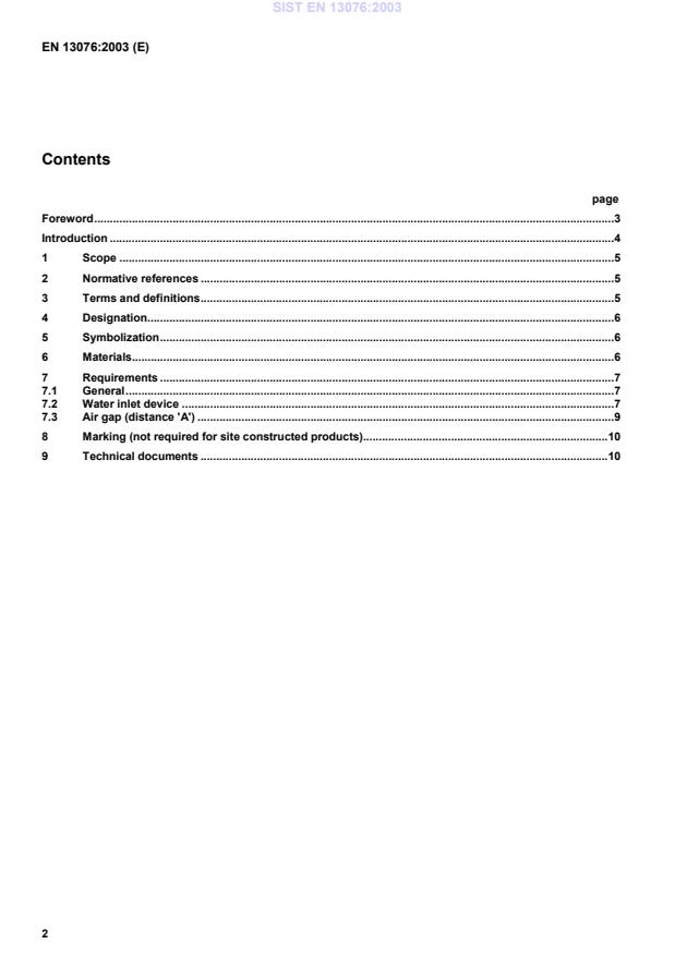 SIST EN 13076:2003 is a standard published by the Slovenian Institute for Standardization (SIST). Its full title is "Devices to prevent pollution by backflow of potable water - Unrestricted air gap-Family A - Type A". This standard covers: This CEN standard specifies the characteristics of type AA air gaps for inlet or feed pipes. Air gaps that comply with the requirements of this standard are devices for protection of drinking water installations from pollution. In addition to factory assembled products this standard includes requirements for site constructed air gaps. This is a performance standard for "AA" air gaps. Materials of construction must be fit for the purpose and application to ensure compliance with this standard during normal working use.