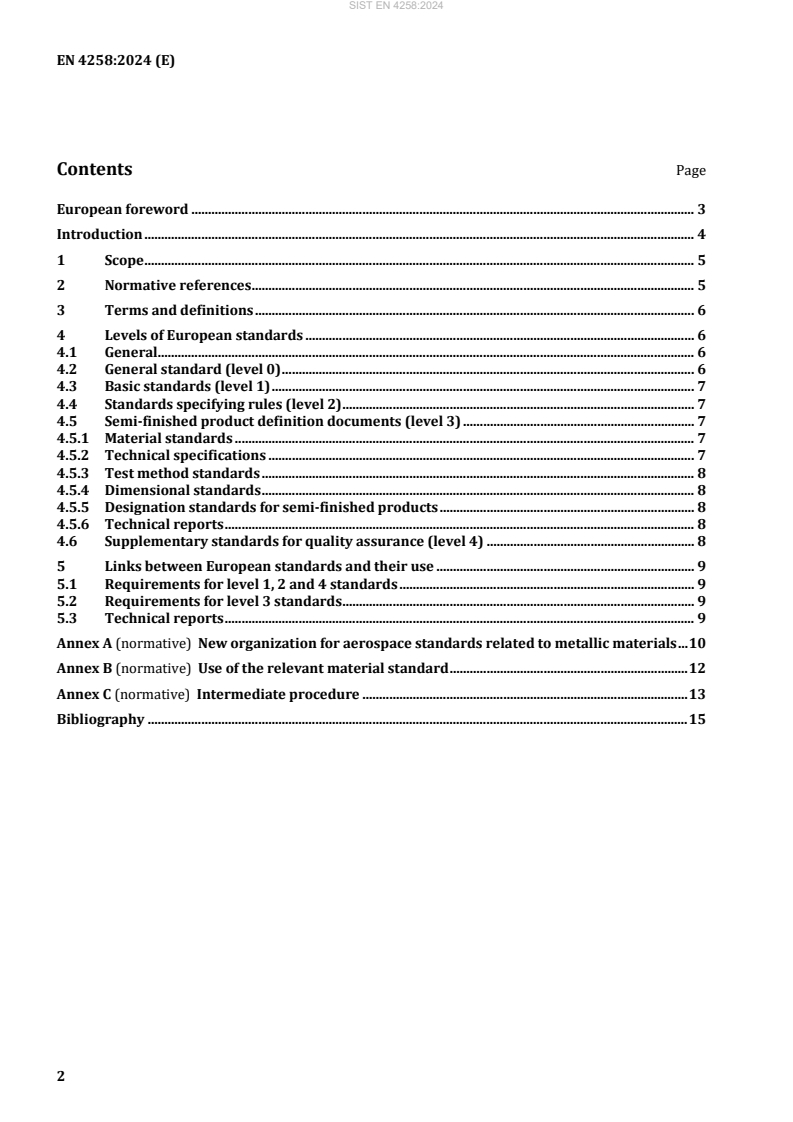 SIST EN 4258:2024 is a standard published by the Slovenian Institute for Standardization (SIST). Its full title is "Aerospace series - Metallic materials - General organization of standardization - Link between types of European Standards and their use". This standard covers: This document specifies the general organization of metallic material standards for aerospace applications, their links with other types of European standards and their use. It corresponds to level 0 (see 4.2). From the date of publication of this document, specifications for different welding and brazing products can be written in only one standard instead of separated material standards. Already existing material standards for filler metals for welding and for brazing can continue to follow this organization.