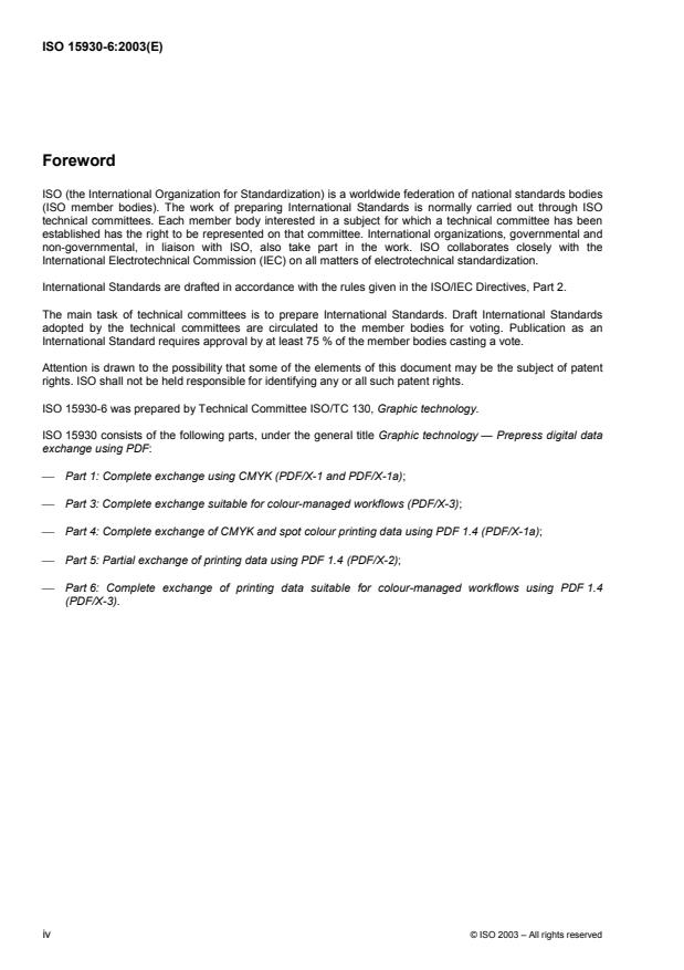 ISO 15930-6:2003 (PDF/X-3) defines a standardized method for the complete exchange of prepress printing data using PDF 1.4. It specifies a single-file, “blind” exchange that contains all elements necessary for final print reproduction and supports colour-managed workflows with CMYK, Gray, RGB and spot colours. The aim is predictable, platform- and transport-independent transfer of compound entities so a receiver can render the printed page as intended by the sender.