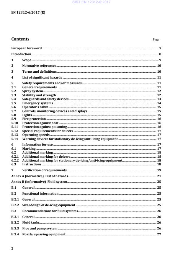 Fluid system . 25 B.1 General . 25 B.2 Functional information . 25 B.2.1 General . 25 B.2.2 Size/design of de-icing equipment . 25 B.3 Recommendations for fluid systems . 26 B.3.1 General . 26 B.3.2 Fluid tanks . 26 B.3.3 Pipe and pump system . 26 B.3.4 Nozzle, spraying equipment . 27 SIST EN 12312-6:2017