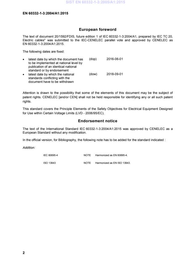 This amendment A1 modifies the European Standard EN 60332-1-3:2004; it was approved by CENELEC on 2015-09-01. CENELEC