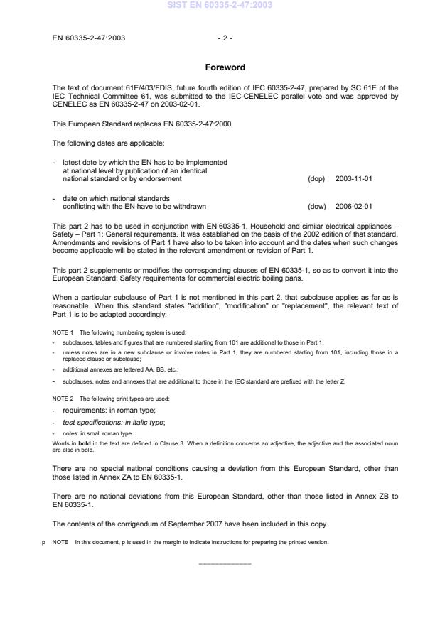 SIST EN 60335-2-47:2003 is a standard published by the Slovenian Institute for Standardization (SIST). Its full title is "Household and similar electrical appliances - Safety -- Part 2-47: Particular requirements for commercial electric boiling pans". This standard covers: Deals with the safety of electrically operated commercial boiling pans not intended for household use. The rated voltage being not more than 250 V for single-phase appliances connected between one phase and neutral, and 480 V for other appliances. Appliances which are within the scope of this standard are typically used in restaurants, canteens, hospitals and commercial enterprises such as bakeries, butcheries,etc. The electrical part of appliances making use of other forms of energy is also witin the scope of this standard.