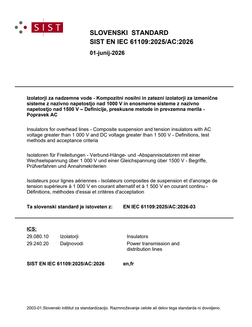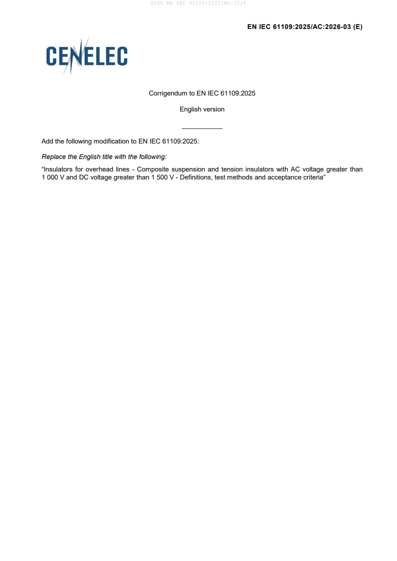 SIST EN IEC 61109:2025/AC:2026 is a corrigendum published by the Slovenian Institute for Standardization (SIST). Its full title is "Insulators for overhead lines - Composite suspension and tension insulators with AC voltage greater than 1 000 V and DC voltage greater than 1 500 V - Definitions, test methods and acceptance criteria". This standard covers: Insulators for overhead lines - Composite suspension and tension insulators with AC voltage greater than 1 000 V and DC voltage greater than 1 500 V - Definitions, test methods and acceptance criteria