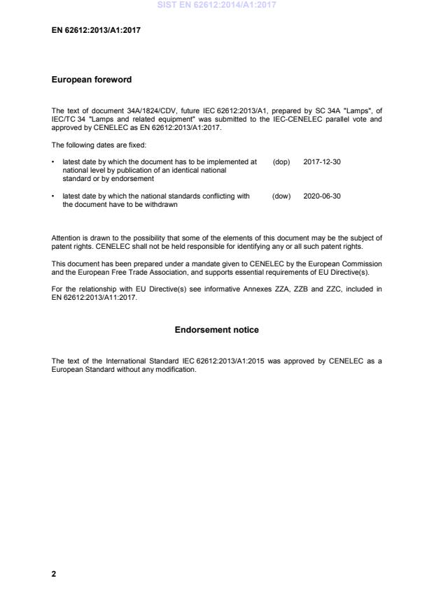 SIST EN 62612:2014/A1:2017 is a amendment published by the Slovenian Institute for Standardization (SIST). Its full title is "Self-ballasted LED lamps for general lighting services with supply voltages > 50 V - Performance requirements (IEC 62612:2013/A1:2015)". This standard covers: 2017-06-08: Final decision is to publish A1 and A11 separately the same day. A1 is identical to IEC A1. 2017-05-31: D156/039: to be published 2017-05-04: Publication on the hold pending TC 34A reply about A11 (pr=58955) 2015-11-18 - CLC/TC 34A request that A1 is published together with the European Amendment A11 (WI 58955).