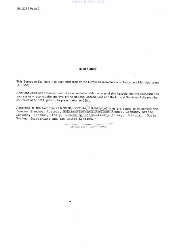 SIST EN 2367:2001 is a standard published by the Slovenian Institute for Standardization (SIST). Its full title is "Aerospace series - Split pins in steel EN 2573". This standard covers: This standard specifies the characteristics of steel EN 2573 split pins passivated, for use in aerospace applications at a maximum temperature of 600 °C.
