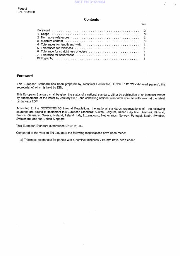 SIST EN 315:2004 is a standard published by the Slovenian Institute for Standardization (SIST). Its full title is "Plywood - Tolerances for dimensions". This standard covers: This European Standard specifies dimensional tolerances of plywood panels (length, width, thickness) and tolerances for squareness and edge straightness. NOTE Some uses of plywood can require narrower tolerances: see specific standards for types or perfor-mance standards.