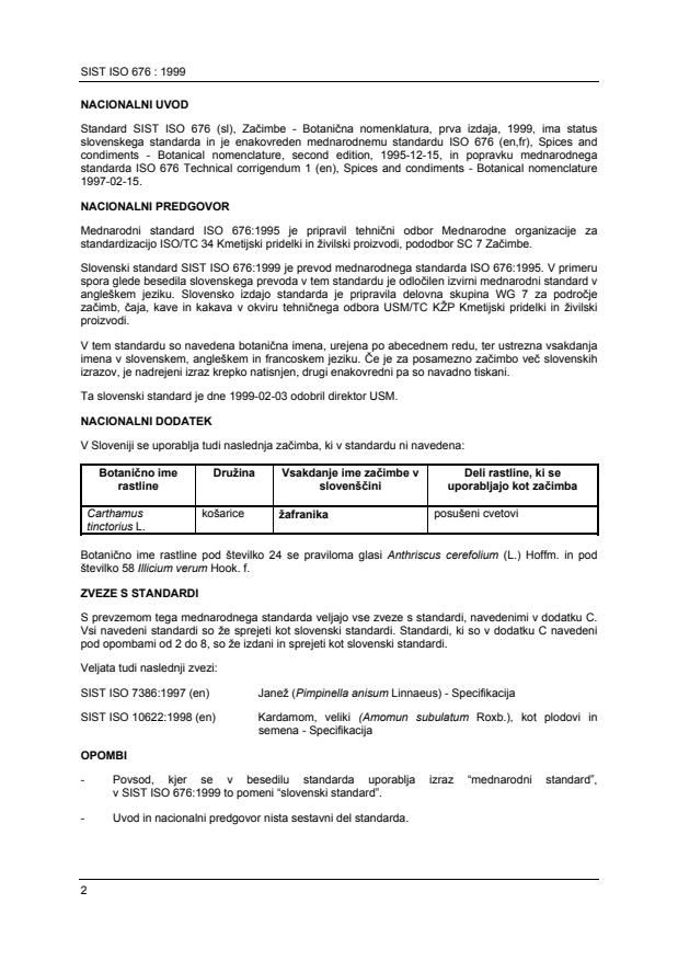SIST ISO 676:1999 is a standard published by the Slovenian Institute for Standardization (SIST). Its full title is "Spices and condiments -- Botanical nomenclature". This standard covers: Gives a non-exhaustive list of the botanical names and common names in English and French of plants or parts of plants used as spices or condiments. Replaces the first edition, which has been technically revised.