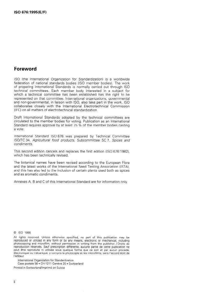 ISO 676:1995 - "Spices and condiments - Botanical nomenclature" is an ISO international standard (second edition, published 1995) that provides a non‑exhaustive bilingual list (English/French) of botanical names and common names for plants or parts of plants used as spices and condiments. Prepared by ISO/TC 34 (Agricultural food products), Subcommittee SC 7 (Spices and condiments), the edition updates botanical names in line with the European Flora and the International Seed Testing Association (ISTA) work and replaces the 1982 first edition.