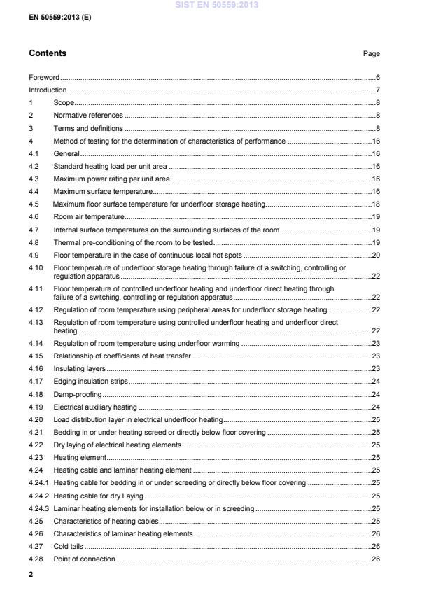Ta evropski standard velja za električno talno ogrevanje stanovanj in vseh ostalih stavb, ki ustrezajo stanovanjem ali so jim vsaj podobne ter imajo največjo nosilnost 4 kN/m². Ta evropski standard določa značilnosti električnega talnega ogrevanja in uvaja preskusno metodo za te značilnosti, ki služi kot informacija za uporabnika. Ta evropski standard ne obravnava: