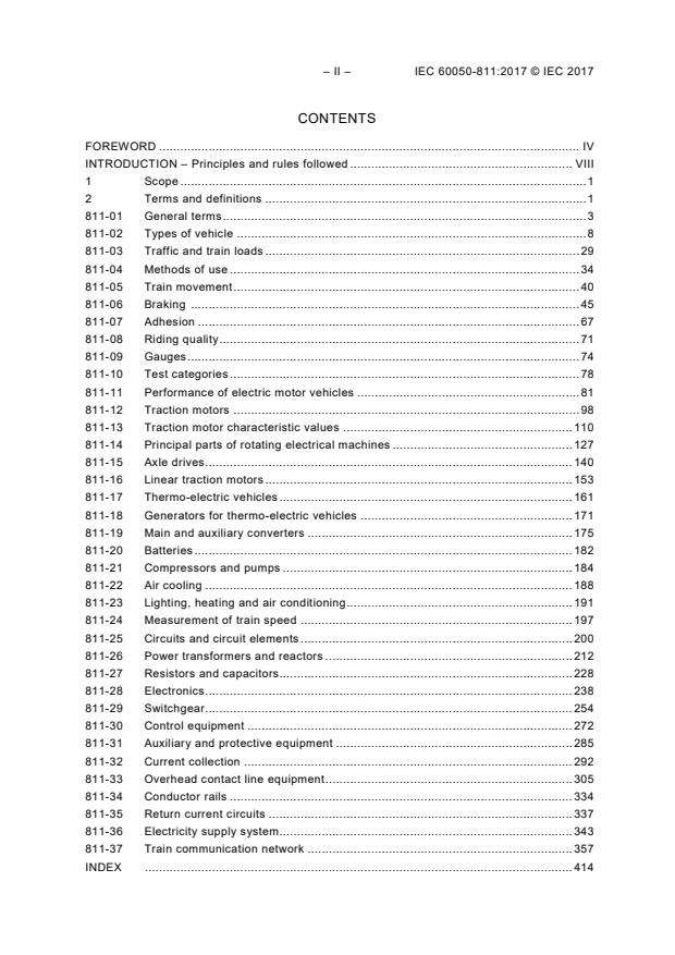 Standard IEC 60050-811:2017 podaja splošno izrazoslovje v zvezi z električno vleko, ki se uporablja v električni opremi in sistemih na železnicah, ter splošne izraze, ki se navezujejo na posamezne vrste uporabe in z njimi povezane tehnologije. Ta nova izdaja vključuje spremembo prejšnje izdaje in jo dopolnjuje. Ta terminologija je skladna s terminologijo, razvito v drugih specializiranih delih mednarodnega elektrotehničnega slovarja (IEV).