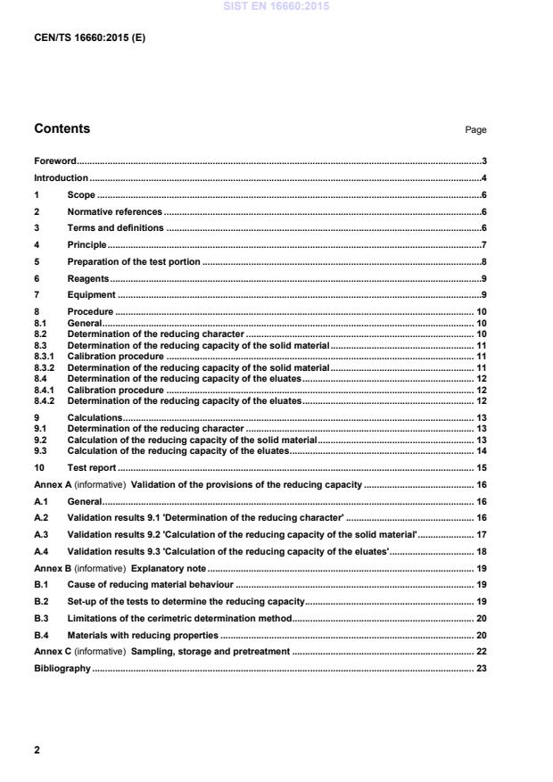 Foreword .3 Introduction .4 1 Scope .6 2 Normative references .6 3 Terms and definitions .6 4 Principle .7 5 Preparation of the test portion .8 6 Reagents .9 7 Equipment .9 8 Procedure . 10 8.1 General . 10 8.2 Determination of the reducing character . 10 8.3 Determination of the reducing capacity of the solid material . 11 8.3.1 Calibration procedure . 11 8.3.2 Determination of the reducing capacity of the solid material . 11 8.4 Determination of the reducing capacity of the eluates . 12 8.4.1 Calibration procedure . 12 8.4.2 Determination of the reducing capacity of the eluates . 12 9 Calculations . 13 9.1 Determination of the reducing character . 13 9.2 Calculation of the reducing capacity of the solid material . 13 9.3 Calculation of the reducing capacity of the eluates . 14 10 Test report . 15 Annex A (informative)