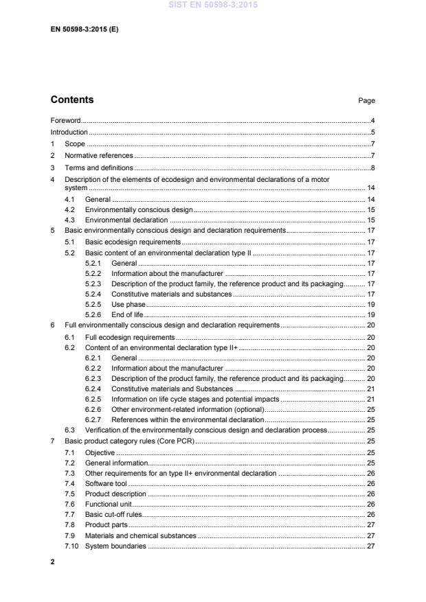 Dieser Teil von EN 50598 legt den Prozess der Implementierung von Grundsätzen für ein umweltbewusstes Produktdesign, der Bewertung der Ökodesignleistung und der Kommunikation der möglichen Umweltwirkun-gen von Antriebssystemen, Motorstartern, Leistungselektronik (z. B. vollständigen Antriebsmodulen, CDM) für Motorantriebsanwendungen im Niederspannungsbereich (unter 1 000 V) und im Leistungsbereich von 0,12 kW bis 1 000 kW über den gesamten Lebenszyklus und die entsprechenden Anforderungen fest. Er legt den Inhalt von zwei verschiedenen Arten von Umweltdeklarationen fest: – die Grundversion, eine Typ II-Umweltdeklaration mit Basisdaten und qualitativen Angaben zum Öko-design, wie in EN ISO 14021 festgelegt; – die Vollversion, eine Typ III-Umweltdeklaration, wie in EN ISO 14025 festgelegt, einschließlich quantitativ bewerteter möglicher Umweltauswirkungen. Hierfür wurden Produktkategorie-Regeln (en: Product Category Rules – PCR) für Motorsystemkomponenten aufgenommen, um eine harmonisierte Methodik für die Erstellung von Ökobilanzen sicherzustellen. Dieser Teil von EN 50598 ist mit den anwendbaren generischen und horizontalen Umweltnormen harmonisiert und enthält zusätzliche Einzelheiten, die für die oben genannten Produkte maßgeblich sind. Dieser Teil von EN 50598 gilt für die Komponenten eines Motorsystems nach der Definition in EN 50XXX 1.