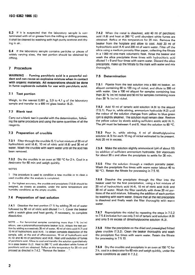 - Scope and principle: Dissolve a weighed test portion, remove silica (perchloric acid dehydration), precipitate nickel as the dimethylglyoxime complex from a tartrato‑ammoniacal medium, collect, dry and weigh the precipitate; correct for residual nickel in filtrates by AAS.